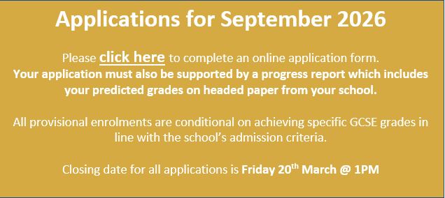 - First priority will be given to students from within the school, pre-16, and then to external applicants subject to availability.